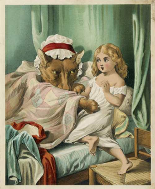 «Gustave Doré, en una de sus famosas ilustraciones para cuentos, muestra a Caperucita y al lobo juntos en la cama. En el dibujo, el lobo aparece como un animal más bien pacífico, mientras que el aspecto de la niña muestra una preocupación por los poderosos sentimientos ambivalentes que experimenta al contemplar al lobo que yace junto a ella. Caperucita no hace ningún movimiento para escapar. Parece intrigada por la situación, atraída y repelida al mismo tiempo. La combinación de sentimientos que sugieren su cara y su cuerpo se puede describir como fascinación. Es la misma fascinación que el sexo, y todo lo que lo rodea, ejerce sobre la mente infantil»